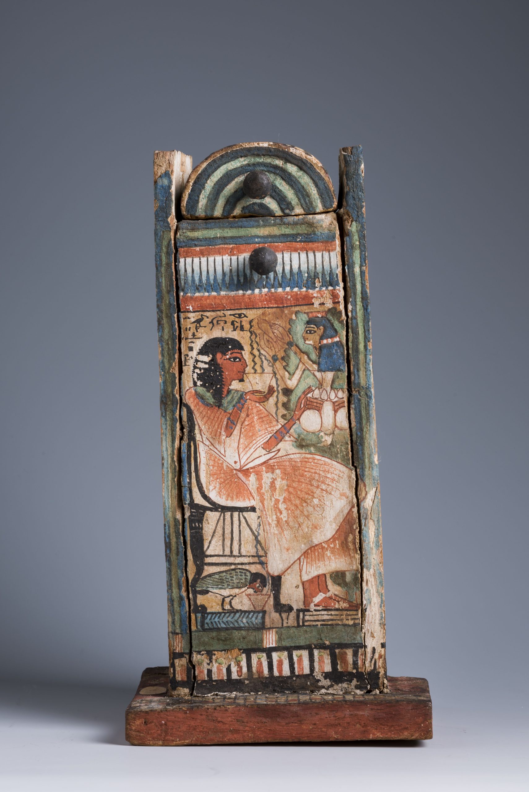 In questo cofanetto in legno dipinto con tanti colori diversi, vediamo il BA di Djehutyhotep mentre beve da una ciotolina, comodamente appollaiato sotto la sedia del suo “proprietario”. Buffo, no?