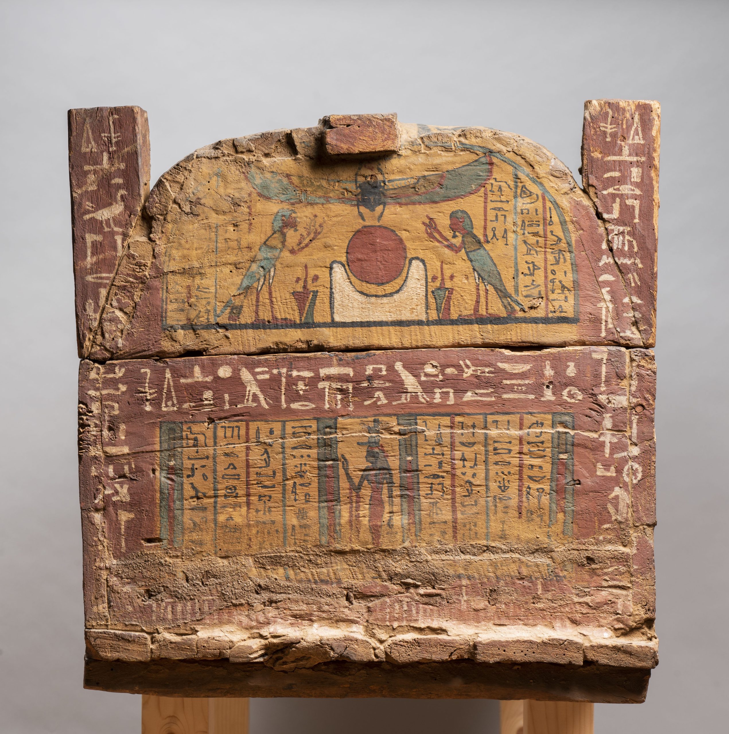 Sul sarcofago esterno di Hor ci sono davvero tantissime immagini che raccontano il viaggio verso l’aldilà. Su uno dei due lati corti della cassa sono dipinti ben due BA rivolti, con le braccia alzate (ebbene sì, oltre alle ali, hanno anche le braccia!), verso uno strano geroglifico: due colline bianche, nel mezzo delle quali sorge un sole rosso fuoco… stanno pregando, sperando che Hor risorga come fa il sole tutte le mattine all’orizzonte. Romantico, vero?