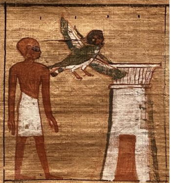 Nel Libro dei morti di Kha, anche il Ba ha il suo spazio di volo! Lo vediamo mentre rientra “a casa”, ovvero nella tomba nella quale sono sepolti proprio Kha e sua moglie Merit.