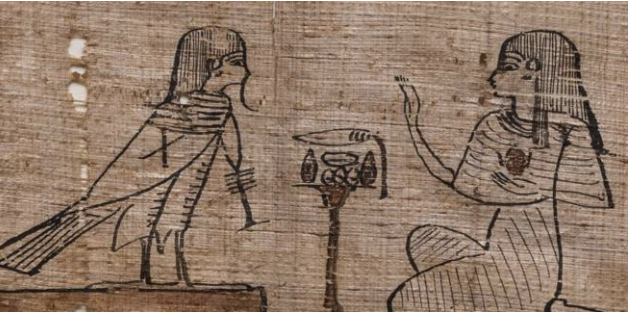 Osserva bene questa scena. Una donna/albero versa acqua da una brocca su un vassoio pieno di offerte. Un BA beve l’acqua che cola dal vassoio, facendo una coppetta con le mani… esattamente come facciamo noi quando troviamo per caso una fontanella al parco o in città!